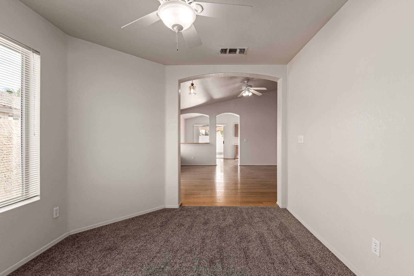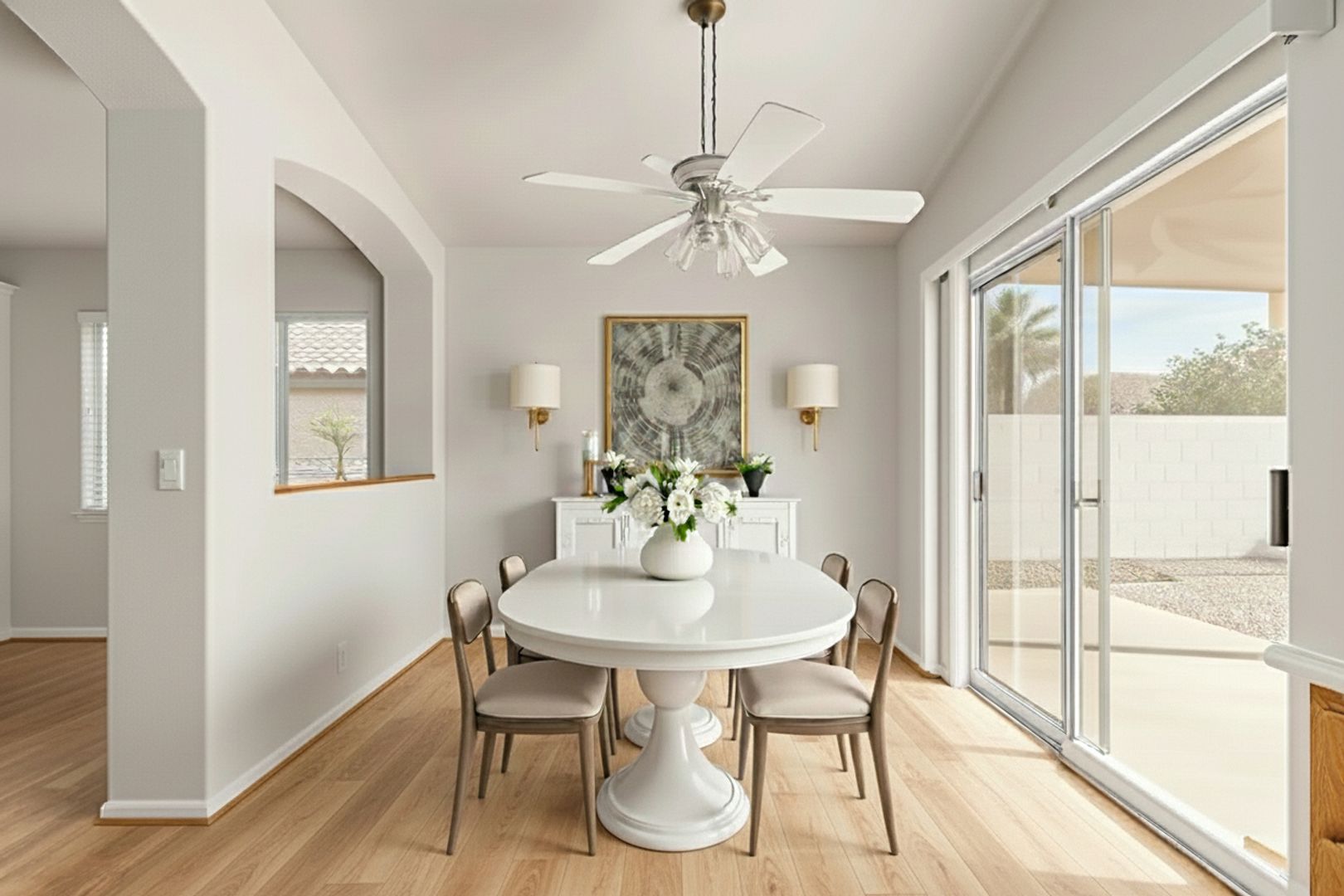 Welcome to this inviting 3-bedroom, 2-bath home with a versatile office/den — perfect for work or play. This highly sought-after single-level floor plan features desirable north/south exposure and elegant wood flooring throughout the main living areas. The spacious great room boasts vaulted ceilings, creating an open and airy feel. The updated kitchen offers newer stainless steel appliances and seamlessly connects to the dining area — ideal for entertaining. Retreat to the primary suite complete with dual sinks, a shower/tub combo, and a large walk-in closet. Enjoy easy-care landscaping and a sunny south-facing patio, perfect for relaxing or outdoor dining. Conveniently located between Downtown Chandler, Downtown Gilbert, and SanTan Village, you’ll love having shopping, dining, and entertainment just minutes away!