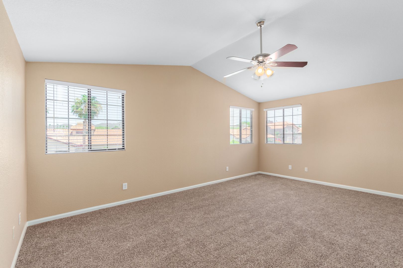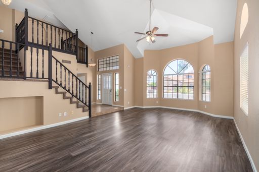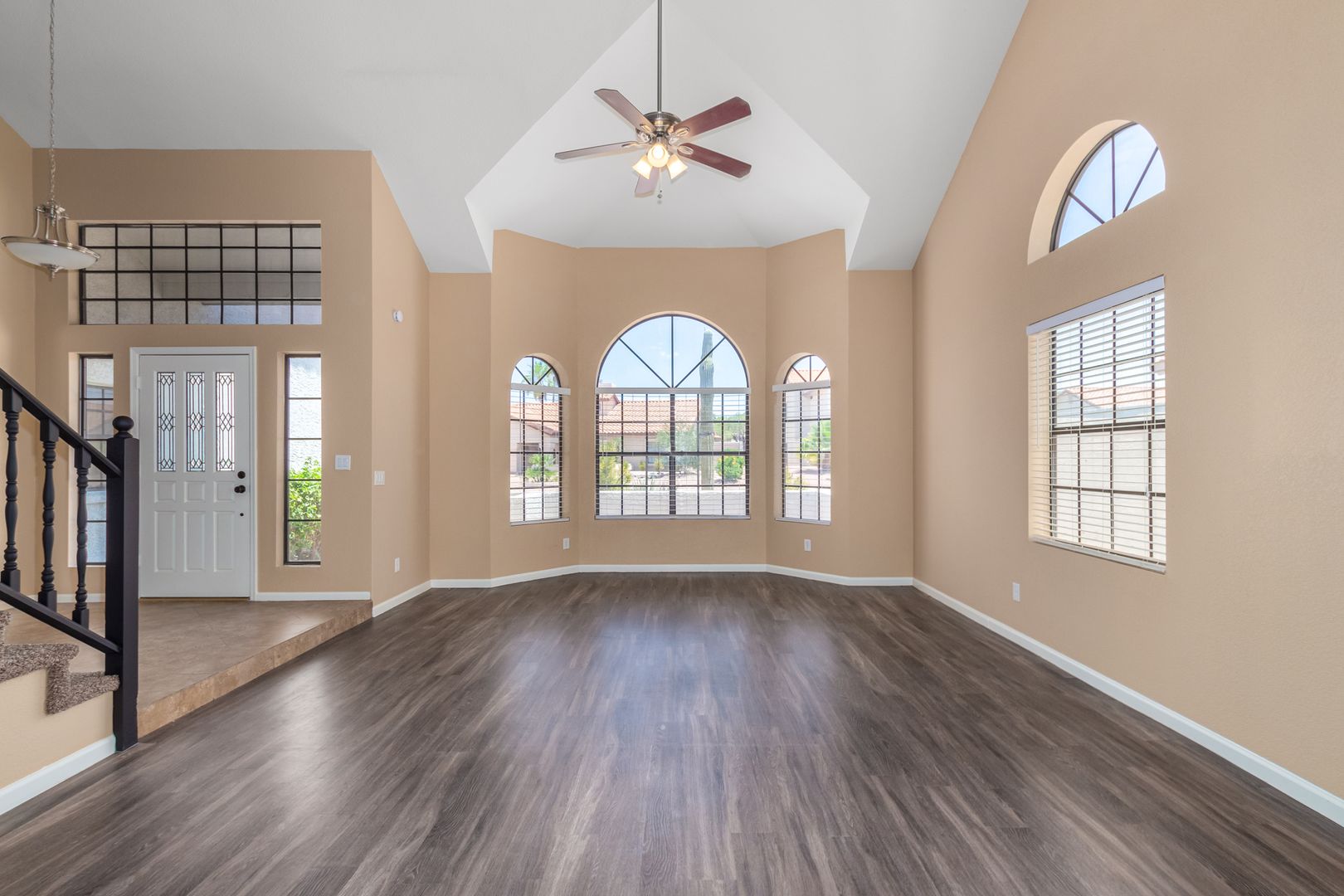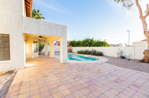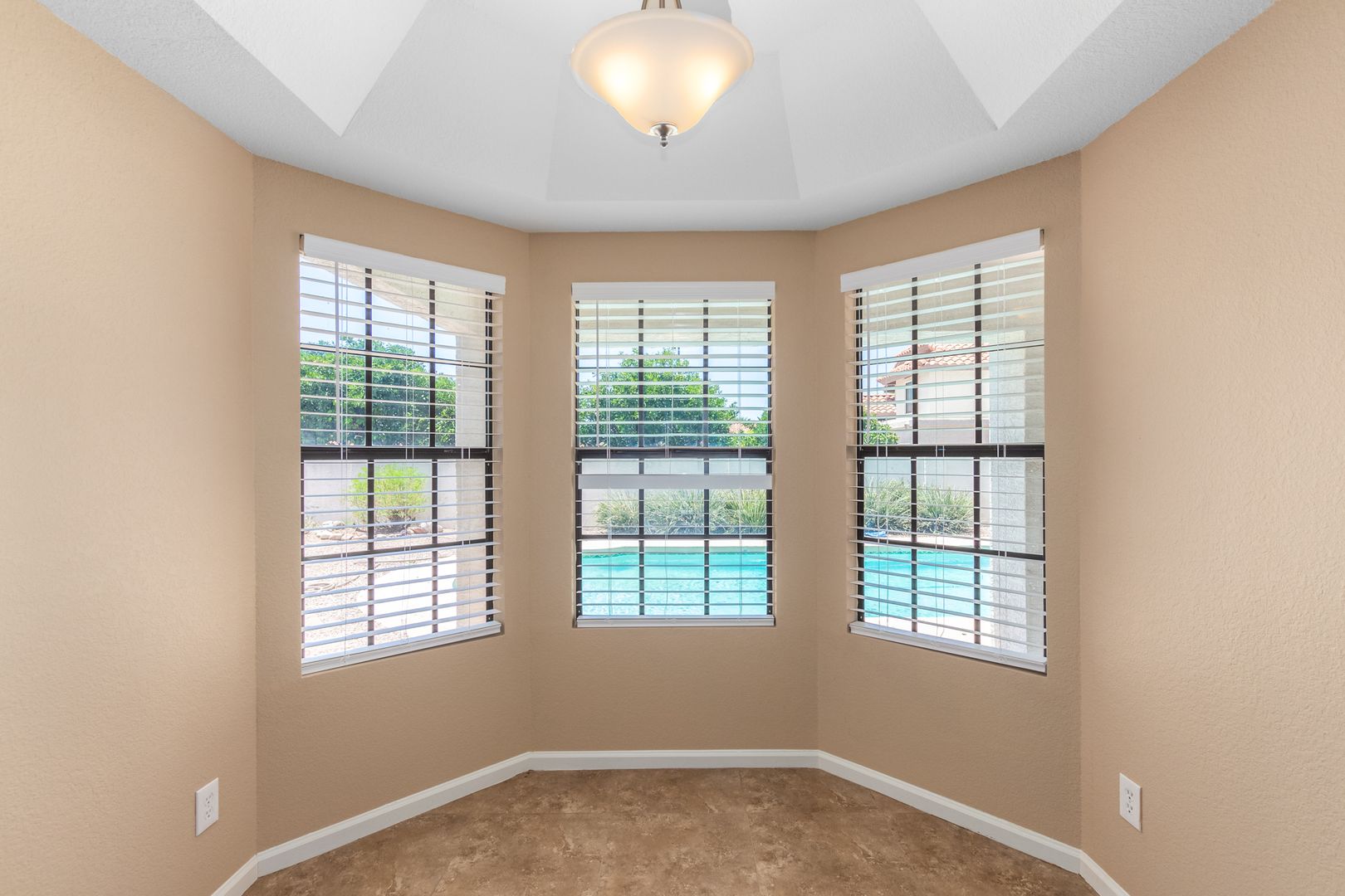 Located in upscale community, this 4 bedroom two-story home boasts 4 bedrooms upstairs, a convenient office on the first floor, and plenty of space for all. As you enter, you'll be greeted by cathedral style vaulted ceilings with updated fans and fixtures. The formal dining and living room are perfect for entertaining. Granite countertops in kitchen with stainless steel appliances and newly refinished, white cabinets. Stunning fireplace in spacious family room. 1/2 bath downstairs with granite counter vanity located right next to the office space. Upstairs, you'll discover the bedrooms and a small loft area overlooking the living room. Large master bedroom with walk-in closet and full master bath including custom tile walk-in shower, large tub, and dual sinks. Dual sinks with granite countertops. Tile and glass door walk-in shower and separate tub. 3 guest bedrooms are all generous in size. Located in golf course community with additional amenities including community pool and workout facility. 3 car garage with clean desert landscaping in front and back. Sparkling swimming pool with POOL SERVICE INCLUDED!