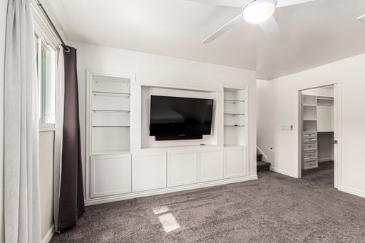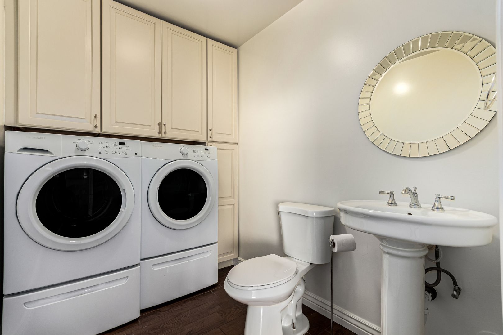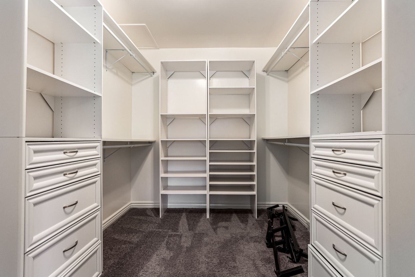 A convenient powder bath is located on the main level, along with a full-size laundry area and extra storage. The downstairs primary suite offers custom built-ins, a fully upgraded bathroom, and a spacious walk-in closet with a custom organization system. Upstairs, two guest bedrooms share a full bathroom.