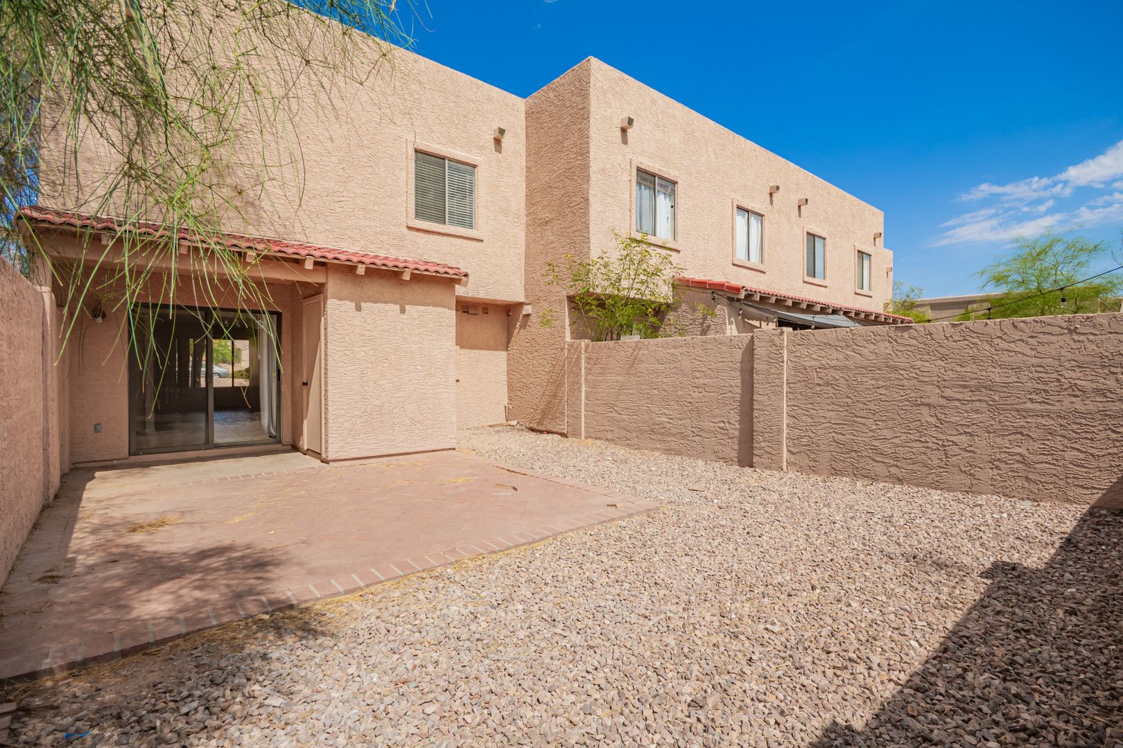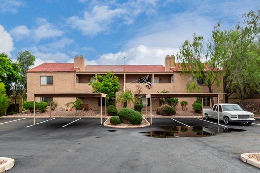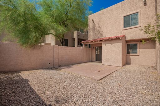 This beautifully updated townhome is ideally located just steps from world-famous Fountain Park, with scenic walking paths, restaurants, and more right around the corner! Inside, you'll find stylish finishes throughout, including 16" tile flooring downstairs and in the bathrooms, and updated wood floors in all the bedrooms. The spacious living area features a granite fireplace and a matching granite wet bar—perfect for entertaining. The kitchen is fully equipped with modern appliances, granite countertops, and ample cabinet space. A convenient powder bathroom on the main floor is ideal for guests. Upstairs, you’ll find all three generously sized bedrooms and two bathrooms. The primary suite is a true retreat with soaring ceilings, a private bath, walk-in closet, separate exit, and mountain views. Enjoy outdoor living in the fenced backyard with a large brick patio, a covered area with an attached storage room, and plenty of space to relax or entertain. Additional updates include a newer roof, A/C unit, ceiling fans, and sunscreens—all helping to keep the home cool and energy-efficient during the hot summer months. With plenty of storage and thoughtful upgrades throughout, this move-in-ready home combines comfort, style, and convenience in one of Fountain Hills’ most desirable locations.