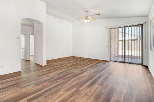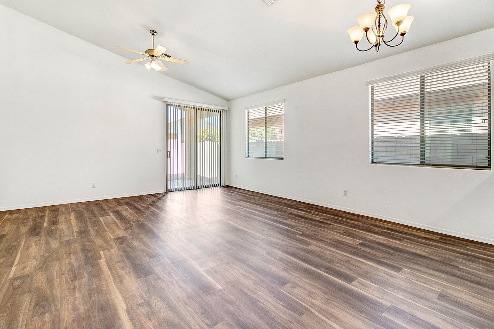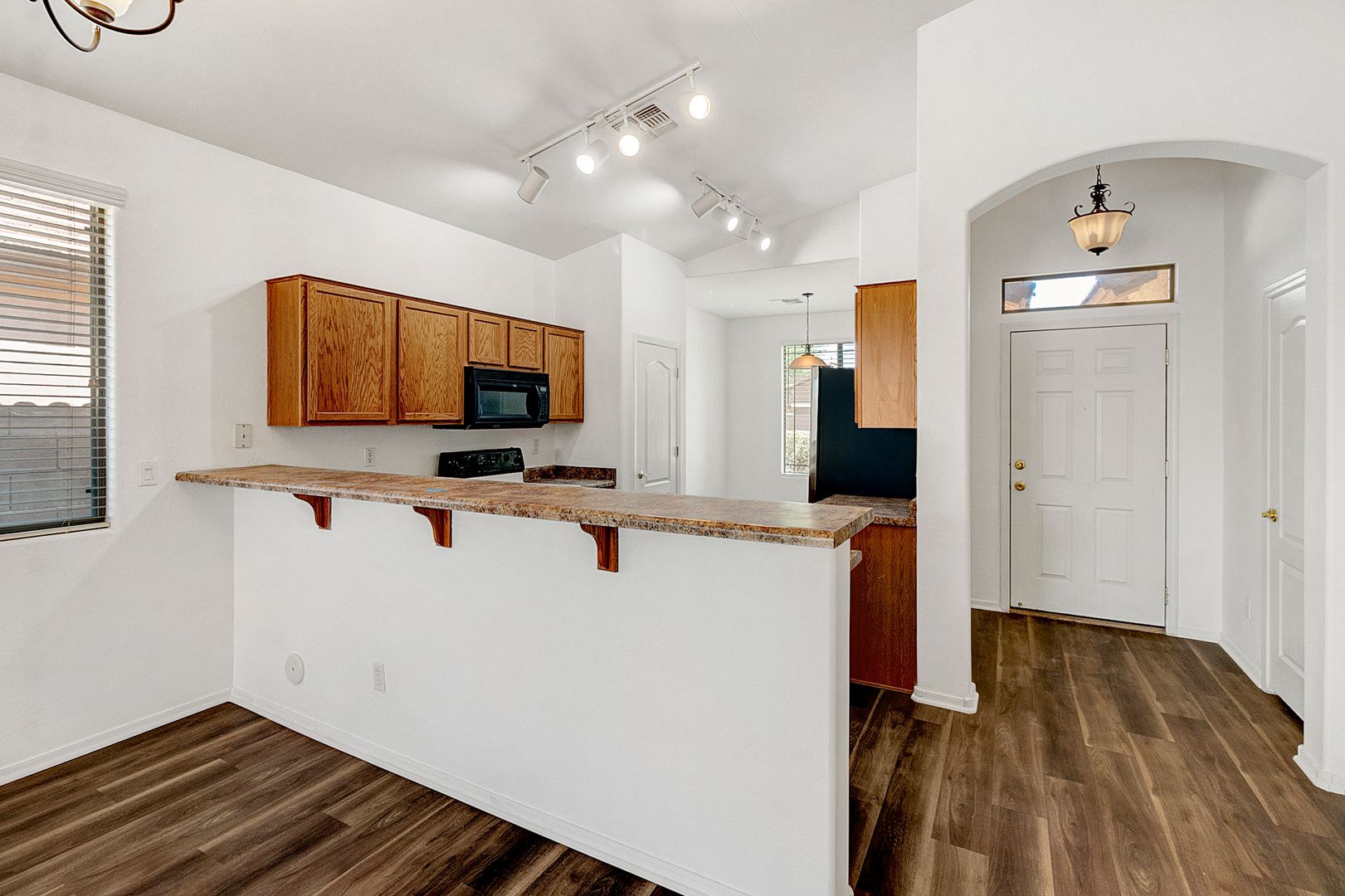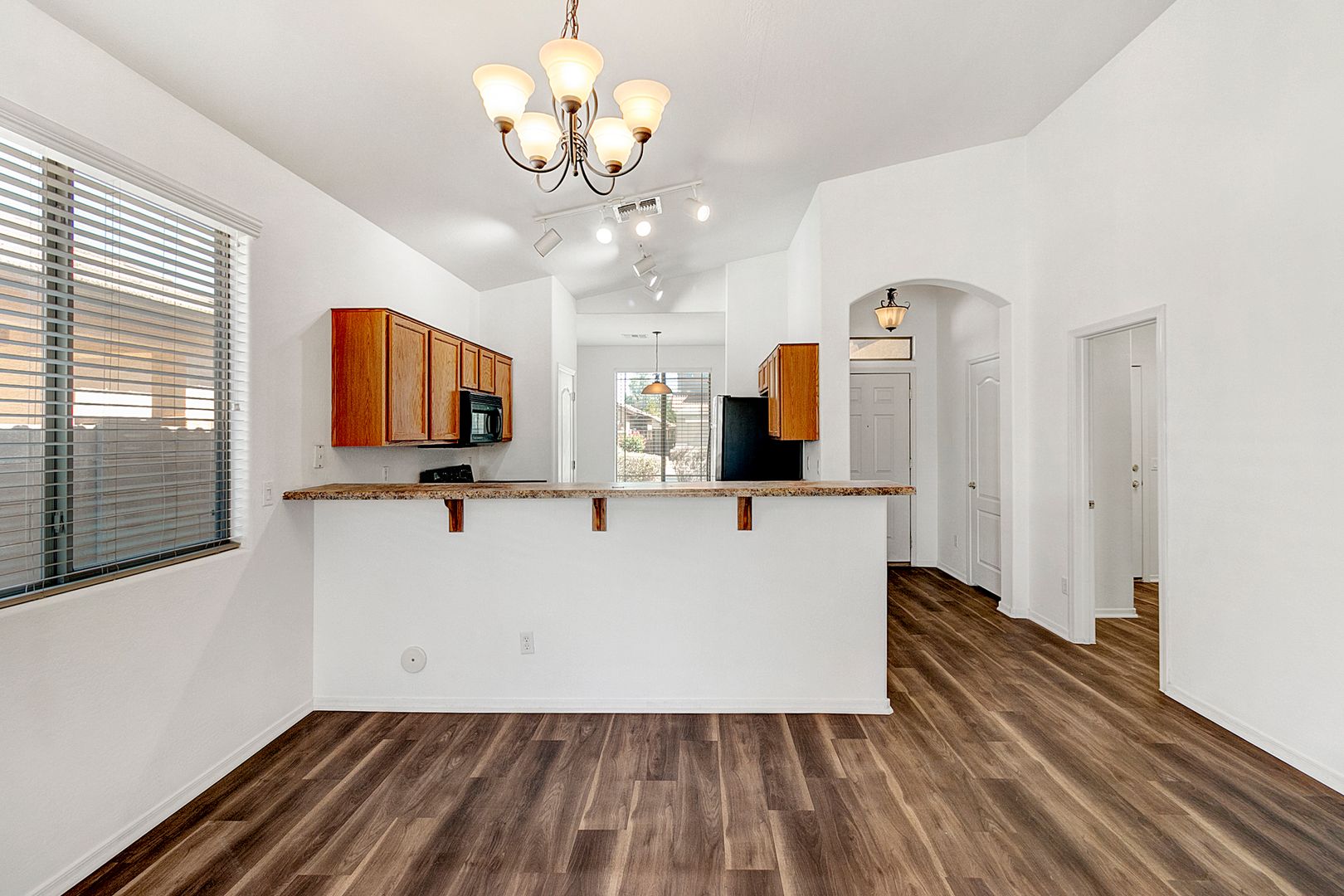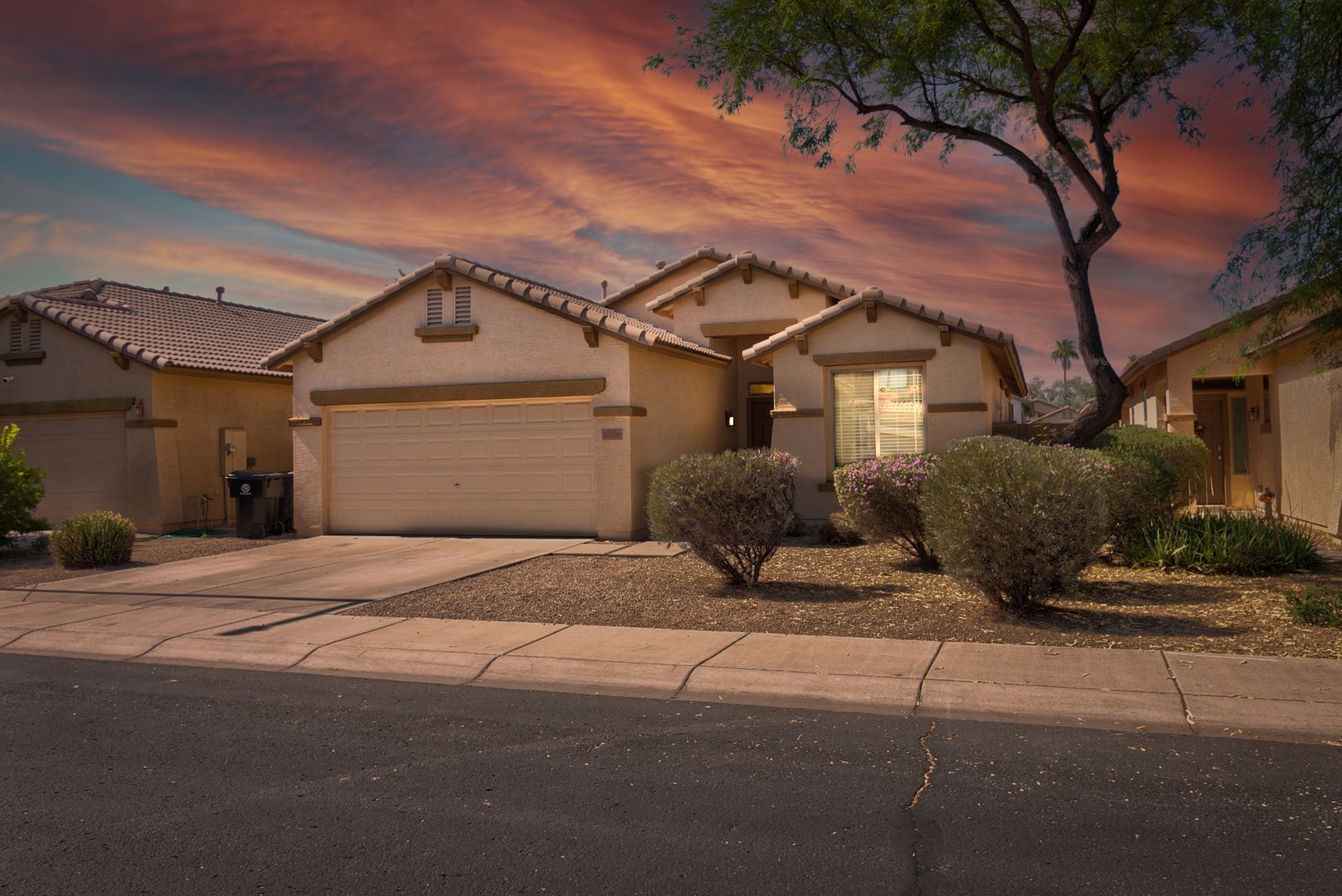 Discover this charming 3-bedroom, 2-bathroom home featuring a bright, open great room floor plan perfect for modern living. The spacious kitchen includes all appliances, a pantry, breakfast bar, and a cozy dining nook. The primary suite offers a relaxing retreat with dual sinks, a separate tub and shower, and a generous walk-in closet. Additional highlights include newer vinyl flooring throughout, wood blinds, a large laundry room, and a 2-car garage. Ideally located near shopping, dining, and the Surprise baseball stadium, this home blends comfort and convenience in one desirable package!