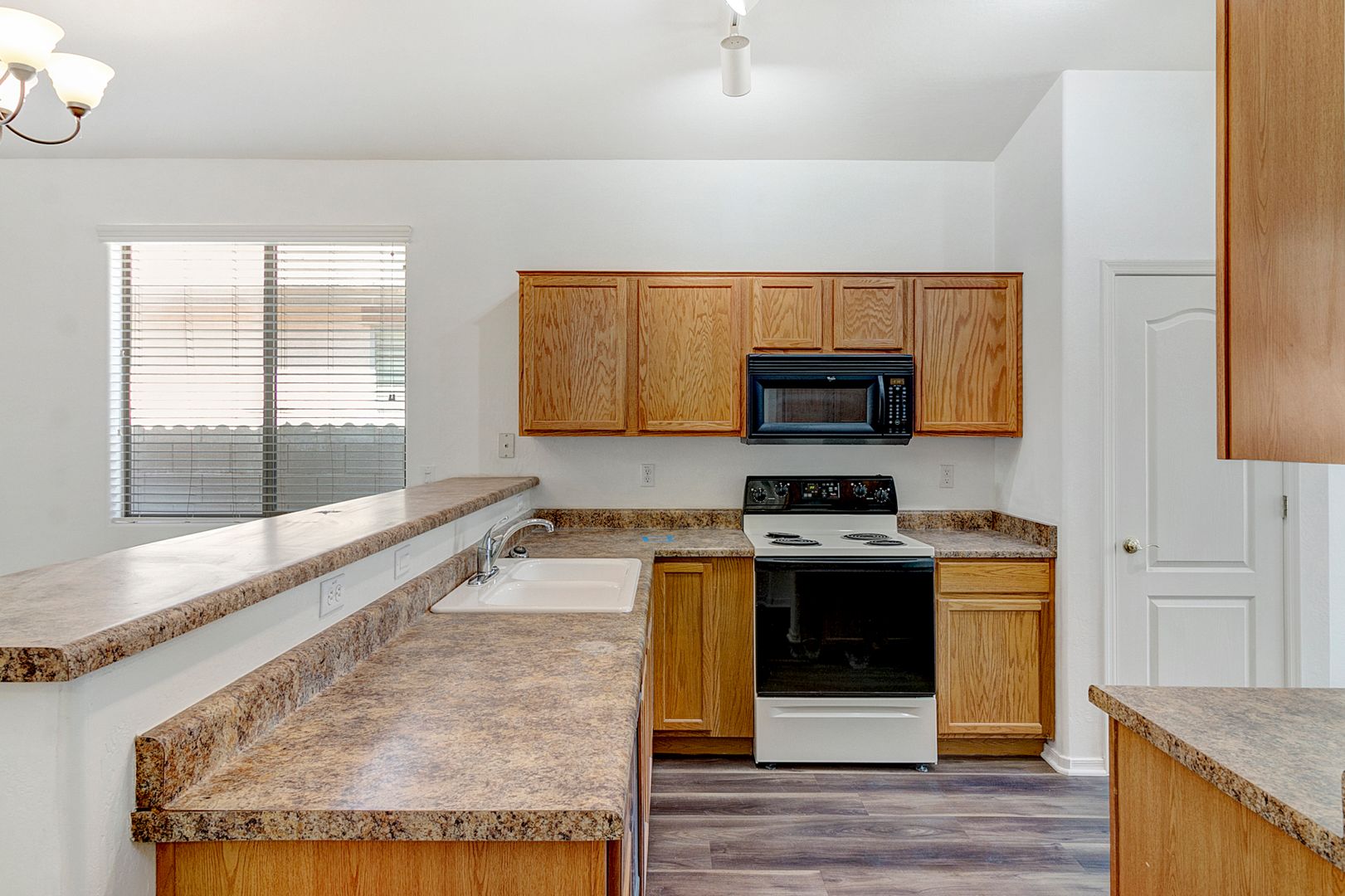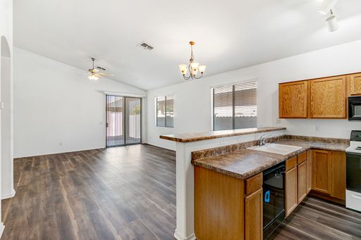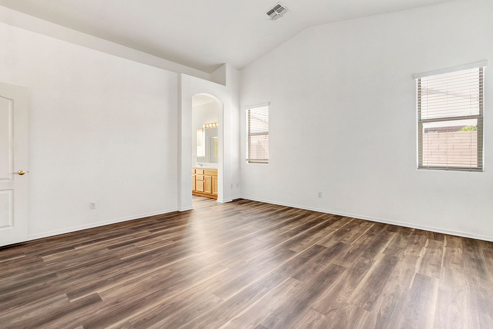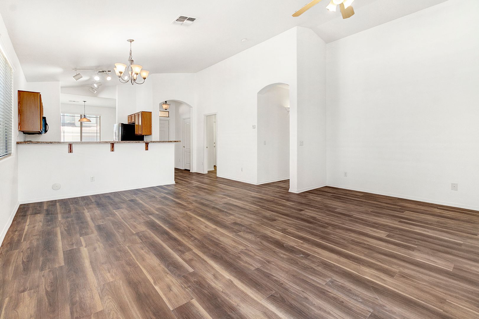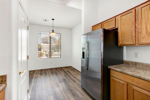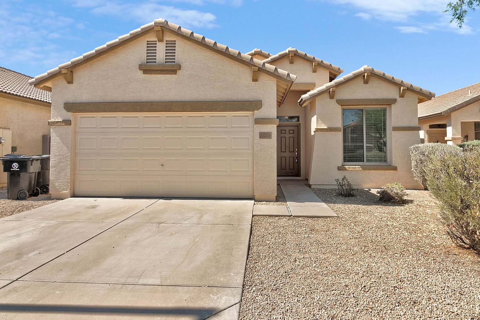 Discover this charming 3-bedroom, 2-bathroom home featuring a bright, open great room floor plan perfect for modern living. The spacious kitchen includes all appliances, a pantry, breakfast bar, and a cozy dining nook. The primary suite offers a relaxing retreat with dual sinks, a separate tub and shower, and a generous walk-in closet. Additional highlights include newer vinyl flooring throughout, wood blinds, a large laundry room, and a 2-car garage. Ideally located near shopping, dining, and the Surprise baseball stadium, this home blends comfort and convenience in one desirable package!