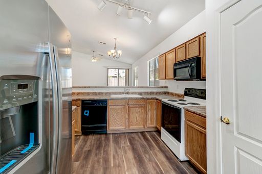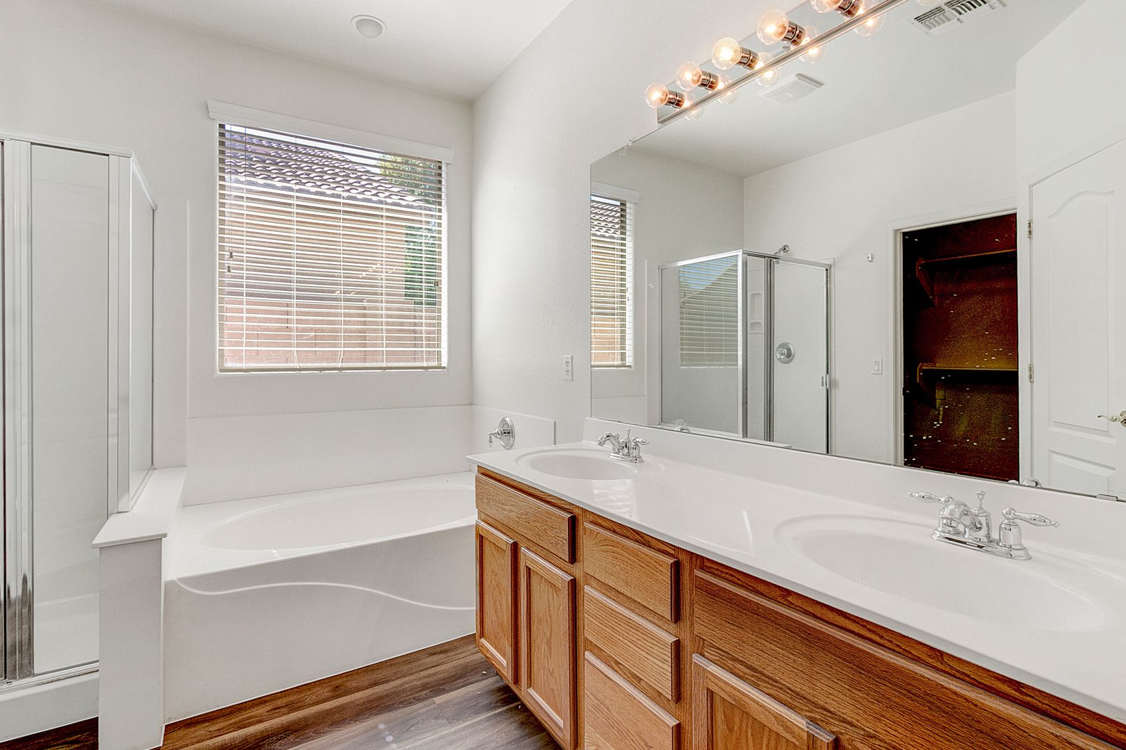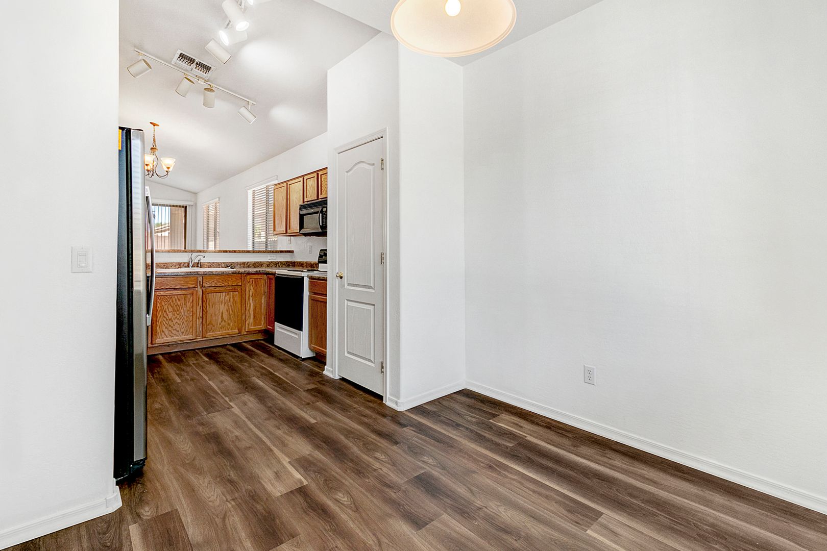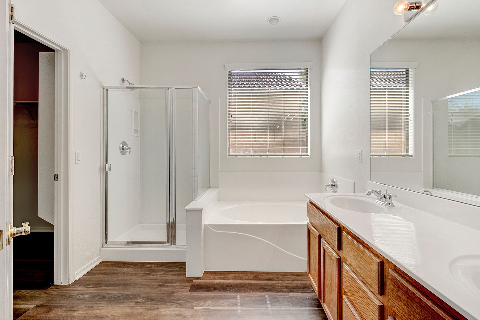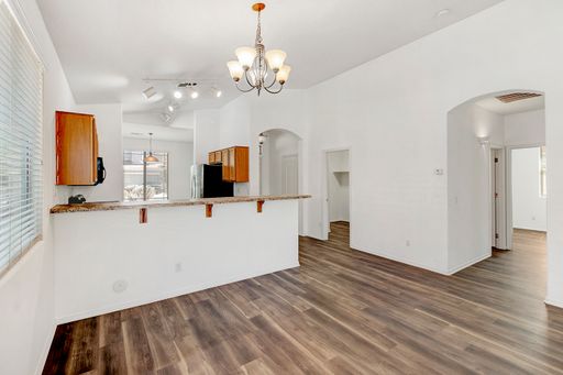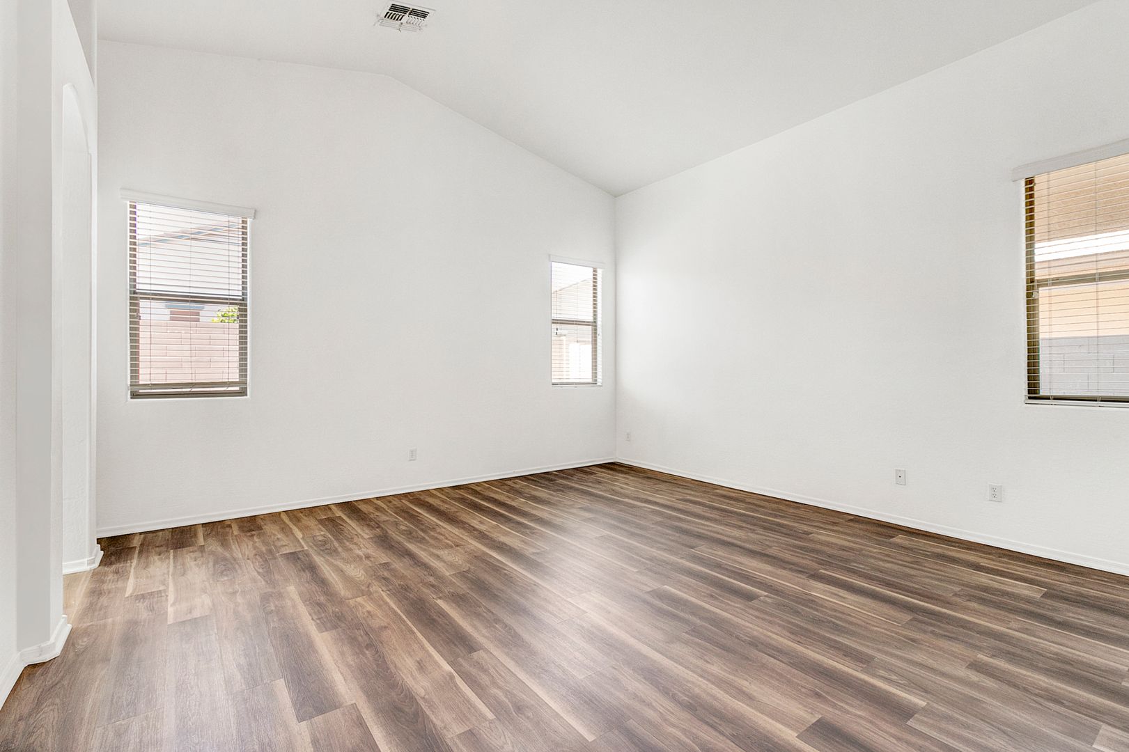 Discover this charming 3-bedroom, 2-bathroom home featuring a bright, open great room floor plan perfect for modern living. The spacious kitchen includes all appliances, a pantry, breakfast bar, and a cozy dining nook. The primary suite offers a relaxing retreat with dual sinks, a separate tub and shower, and a generous walk-in closet. Additional highlights include newer vinyl flooring throughout, wood blinds, a large laundry room, and a 2-car garage. Ideally located near shopping, dining, and the Surprise baseball stadium, this home blends comfort and convenience in one desirable package!